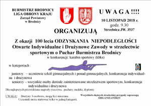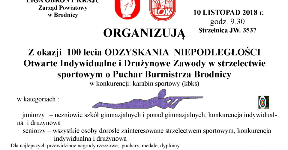 Z okazji obchodów 100-lecia odzyskania przez Polskę niepodległości 10 listopada zapraszamy wszystkich chętnych na otwarte zawody strzeleckie o puchar Burmistrza Brodnicy. Zawody w konkurencji Karabin Sportowy odbędą się w dwu kategoriach: juniorzy – uczniowie szkół gimnazjalnych i ponadgimnazjalnych oraz seniorzy – wszystkie osoby dorosłe zainteresowane strzelectwem sportowym. Przewidziano konkurencje indywidualne i drużynowe (drużyny 3 osobowe, mogą być mieszane). Zawody rozpoczną się o godzinie 9:30 na strzelnicy wojskowej w Brodnicy. Zapraszamy.