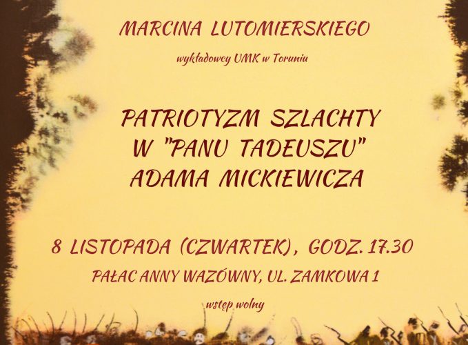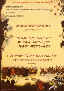 Miejska i Powiatowa Biblioteka Publiczna w Brodnicy zaprasza na wykład dr. Marcina Lutomierskiego (wykładowcy UMK w Toruniu oraz Szkoły Wyższej im. Pawła Włodkowica w Płocku) – Patriotyzm szlachty w „Panu Tadeuszu” Adama Mickiewicza. Spotkanie zorganizowane w ramach obchodów 100-lecia odzyskania przez Polskę niepodległości odbędzie się 8 listopada (czwartek) o godz. 17:30 w Pałacu Anny Wazówny, ul. Zamkowa 1. Wstęp wolny. Serdecznie zapraszamy!!!