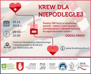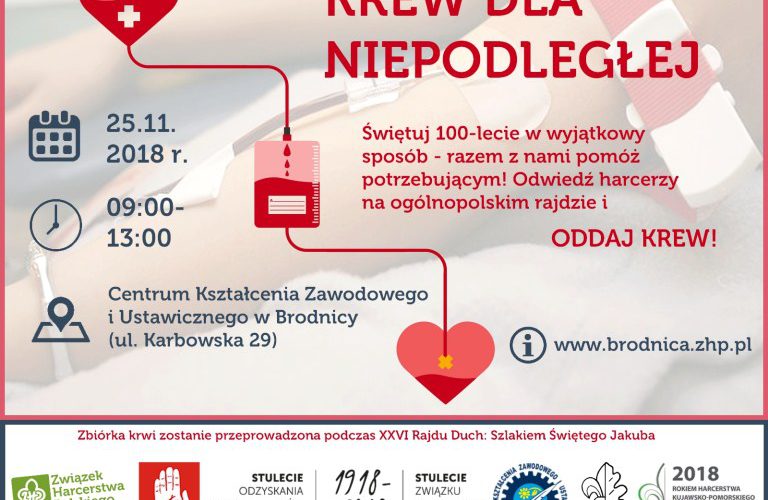 KREW DLA NIEPODLEGŁEJ” to akcja kierowana nie tylko do harcerzy, tylko do wszystkich mieszkańców miasta i powiatu jak i odwiedzających nasze miasto. Proponujemy świętowanie 100-lecia odzyskania przez Polskę niepodległości w wyjątkowy sposób. Razem możemy pomóc wielu potrzebującym.