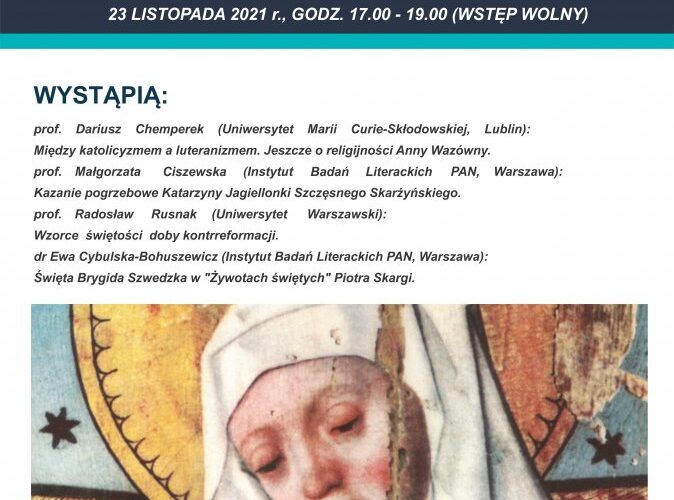 4. dr Ewa Cybulska-Bohuszewicz (IBL PAN Warszawa): Święta Brygida Szwedzka w „Żywotach świętych” Piotra Skargi.