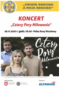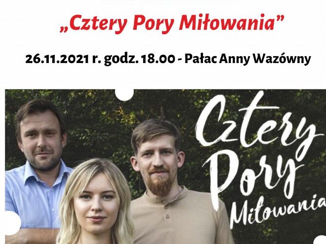 W ramach XXX Dni Kultury Chrześcijańskiej 26 listopada o godz. 18.00 zapraszamy do Pałacu Anny Wazówny na koncert zespołu „Cztery Pory Miłowania” – wstęp na wejściówki. Wejściówki do odebrania 22 – 23 Listopada w godz. 12.00 – 15.00 w portierni Urzędu Miejskiego w Brodnicy. Organizatorem wydarzenia jest Urząd Miejski w Brodnicy