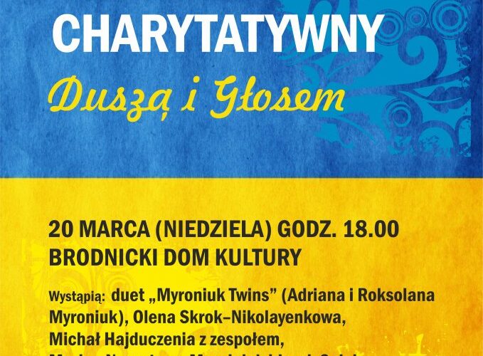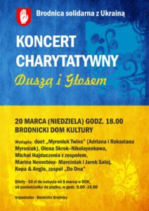W niedzielę 20 marca br. w Brodnickim Domu Kultury o godz. 18.00 odbędzie się wyjątkowy charytatywny „Duszą i Głosem – Brodnica solidarna z Ukrainą”. Bilet na koncert kosztuje 50 złotych. Będzie można go kupić od 8 marca w BDK od poniedziałku do piątku w godzinach 9.00 – 18.00. Organizatorem koncertu jest Burmistrz Brodnicy Jarosław Radacz. Na scenie wystąpią artyści pochodzący z Ukrainy oraz artyści z Brodnicy solidaryzujący się z ofiarami wojny na Ukrainie. Usłyszymy w ich wykonaniu piosenki ukraińskie i polskie. Zaśpiewają i zagrają: duet „Myroniuk Twins” (Adriana i Roksolana Myroniuk), Olena Skrok–Nikolayenkowa, Michał Hajduczenia z zespołem, Marina Nesvetova-Marciniak i Jarek Salej, Kepa i Angie oraz zespół „Do dna”. Wszyscy występujący artyści oraz osoby zaangażowane w organizację koncertu działają charytatywnie.