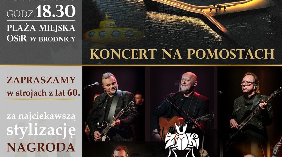 Muzycy zagrają w wyjątkowej scenerii, bo na PLAŻY MIEJSKIEJ OSiR w BRODNICY, na tarasie widokowym, łączącym dwa brzegi jeziora Niskie Brodno. Każdy z widzów będzie miał możliwość włączenia się w ten niezwykły performance – unosząc się na rockowej fali światła i dźwięków, zanurzyć się w oceanie muzyki i kolorowych lat 60! Wejdźmy razem do świata butów na koturnach, kolorowych koszul z długimi kołnierzami typu „lizak”, spodni „dzwonów” i dzieci kwiatów – najciekawszy strój zostanie nagrodzony!