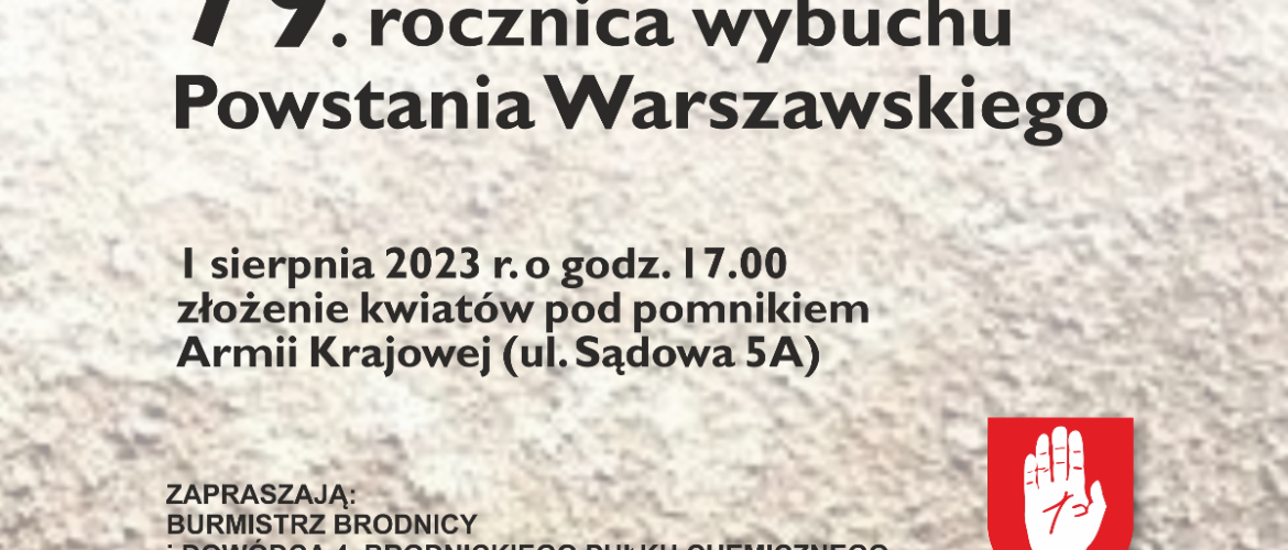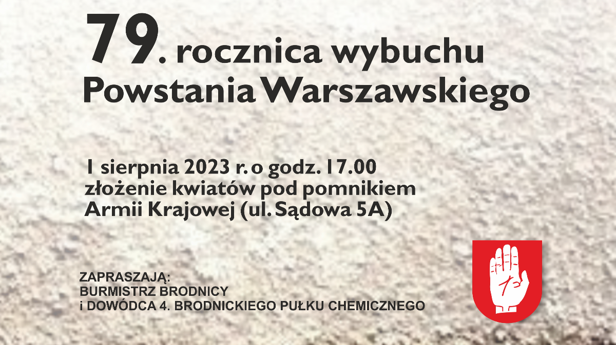 Burmistrz Brodnicy oraz Dowódca 4. Brodnickiego Pułku Chemicznego zapraszają na uroczystości patriotyczne z okazji 79. rocznicy wybuchu Powstania Warszawskiego. Uroczystości rozpoczną się 1 sierpnia o godz. 17:00 pod pomnikiem Armii Krajowej (plac przed kościołem klasztornym).