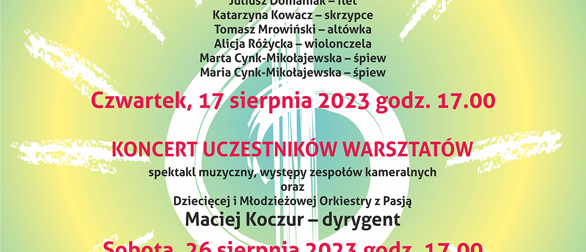17 sierpnia o godz. 17:00 zapraszamy do BDK na koncert w wykonaniu pedagogów, prowadzących w Bachotku warsztaty instrumentalne, a 26 sierpnia, o godz. 17:00 wystąpi Dziecięca i Młodzieżowa Orkiestra Wakacyjna, złożona z uczestników tychże warsztatów.