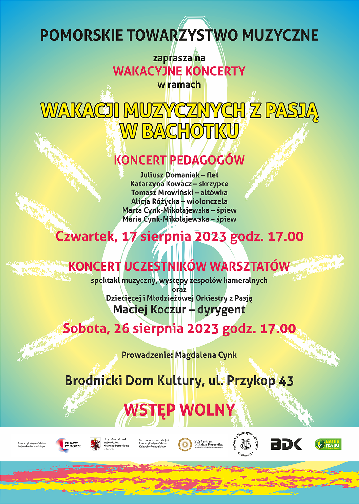 17 i 26 sierpnia Brodnicki Dom Kultury oraz Pomorskie Towarzystwo Muzyczne zapraszają wszystkich melomanów na bezpłatne koncerty towarzyskie, w ramach projektu „WAKACJE MUZYCZNE Z PASJĄ”, który ma na celu promowanie zdolnej młodzieży, pochodzącej z województwa kujawsko-pomorskiego, na co dzień uczęszczającej do szkół muzycznych w klasie skrzypiec, altówki i wiolonczeli.