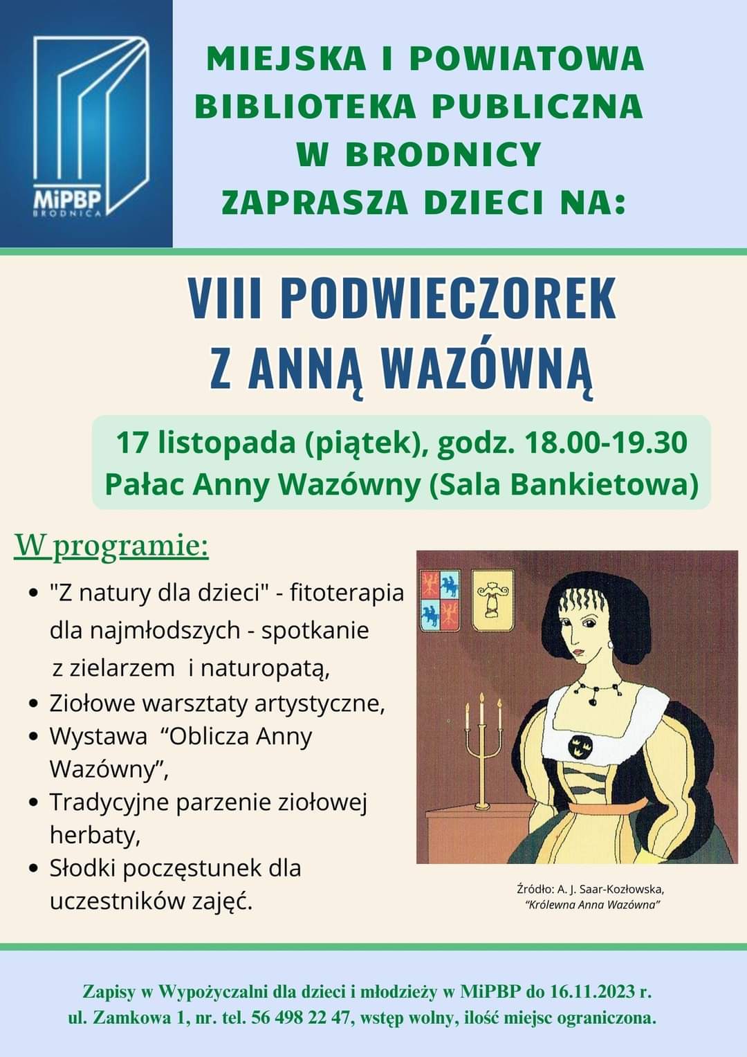 Miejska i Powiatowa Biblioteka Publiczna im. Ignacego Łyskowskiego w Brodnicy zaprasza dzieci na: VIII Podwieczorek z Anną Wazówną.