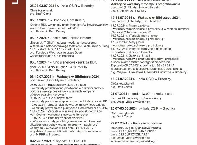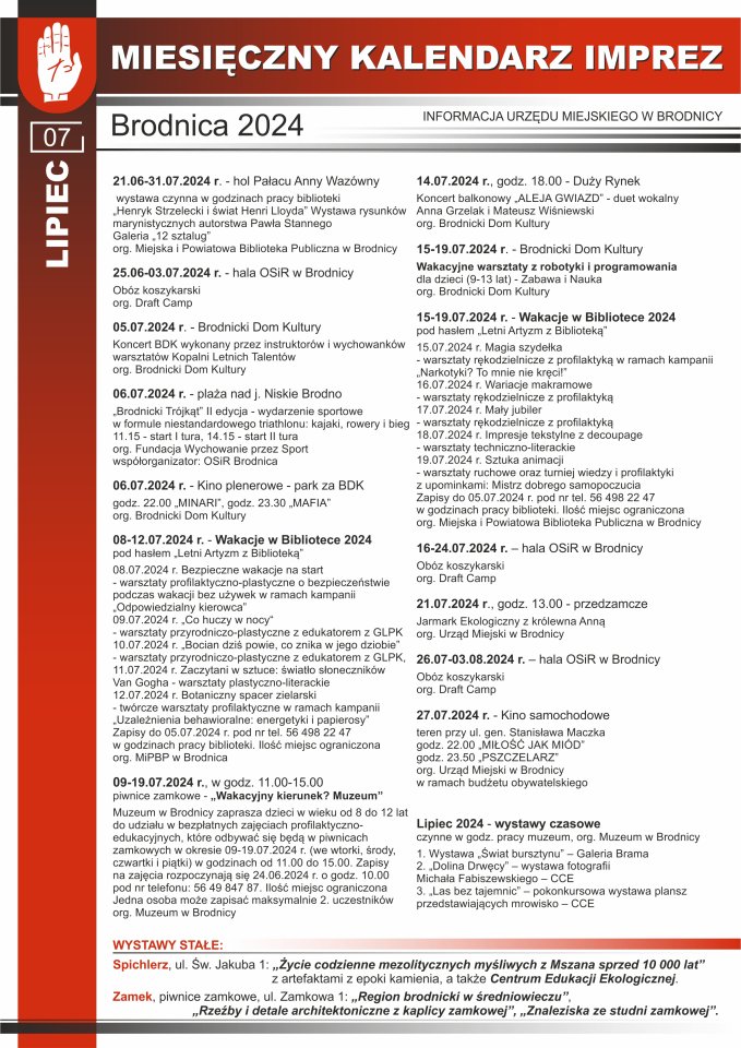 PRZEDSTAWIAMY KALENDARZ IMPREZ MIEJSKICH NA LIPIEC 2024 R. Plakat do wydarzenia ZAPRASZAMY NA NADCHODZĄCE WYDARZENIA Źródło: Urząd Miejski w Brodnicy