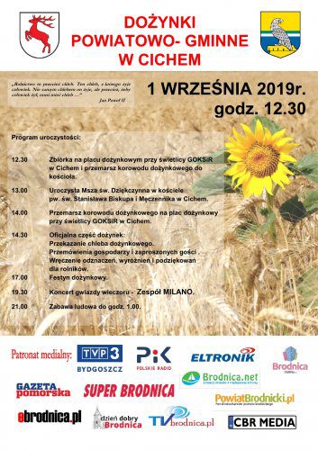 Podczas dożynek w najbliższą niedzielę najpierw będzie oficjalnie i uroczyście, a następnie biesiadnie. Zbiórkę przed częścią oficjalną organizatorzy wyznaczyli na godzinę 12:30 na placu przed świetlicą wiejską w Cichem. Tam zostanie utworzony korowód dożynkowy, w którym uczestnicy święta plonów przemaszerują do kościoła. Po mszy św. dziękczynnej nastąpi przemarsz z orkiestrą na plac przy świetlicy, gdzie nastąpi rozpoczęcie uroczystości dożynkowych. Starostowie dożynkowi przekażą gospodarzom święta plonów – Staroście Brodnickiemu i Wójtowi Gminy Zbiczno – bochen chleba upieczony z mąki z tegorocznych zbiorów, wręczone zostaną odznaczenia i wyróżnienia zasłużonym rolnikom oraz nagrody za Powiatowy Konkurs Wieńców i Ozdób Dożynkowych. Po oficjalnej części gospodarze dożynek zapraszają na festyn z wieloma atrakcjami dla całych rodzin.