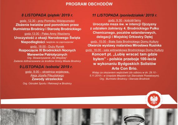 Burmistrz Brodnicy Jarosław Radacz oraz Starosta Brodnicki Piotr Boiński od 8 do 11 listopada zapraszają do uczestnictwa w obchodach Narodowego […] NARODOWE ŚWIĘTO NIEPODLEGŁOŚCI