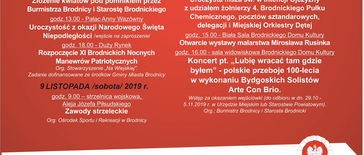 Burmistrz Brodnicy Jarosław Radacz oraz Starosta Brodnicki Piotr Boiński od 8 do 11 listopada zapraszają do uczestnictwa w obchodach Narodowego Święta Niepodległości. Obchody rozpoczną się 8 listopada o godz. 12:30 przy Pomniku Wdzięczności złożeniem kwiatów przez Burmistrza Brodnicy i Starostę Brodnickiego. Uroczystości w Pałacu Anny Wazówny gdzie m. in. nastąpi wręczenie medali i odznaczeń (wstęp za zaproszeniem) zaplanowano na godzinę 13:00. O godzinie 18:00 na Dużym Rynku w Brodnicy zorganizowane zostaną XI Brodnickie Nocne Manewry Patriotyczne. (org. Stowarzyszenie „Na Wiejskiej”. Zadanie dofinansowanie ze środków Gminy Miasta Brodnicy)