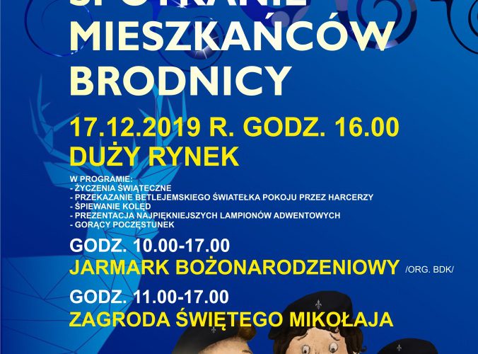 W programie: wspólne śpiewanie kolęd, życzenia świąteczne, przekazanie przez Hufiec ZHP Brodnica Betlejemskiego Światła Pokoju, poczęstunek, część artystyczna oraz prezentacja najpiękniejszych lampionów adwentowych. Wydarzenie realizowane jest w ramach kampanii „POSTAW NA RODZINĘ”.