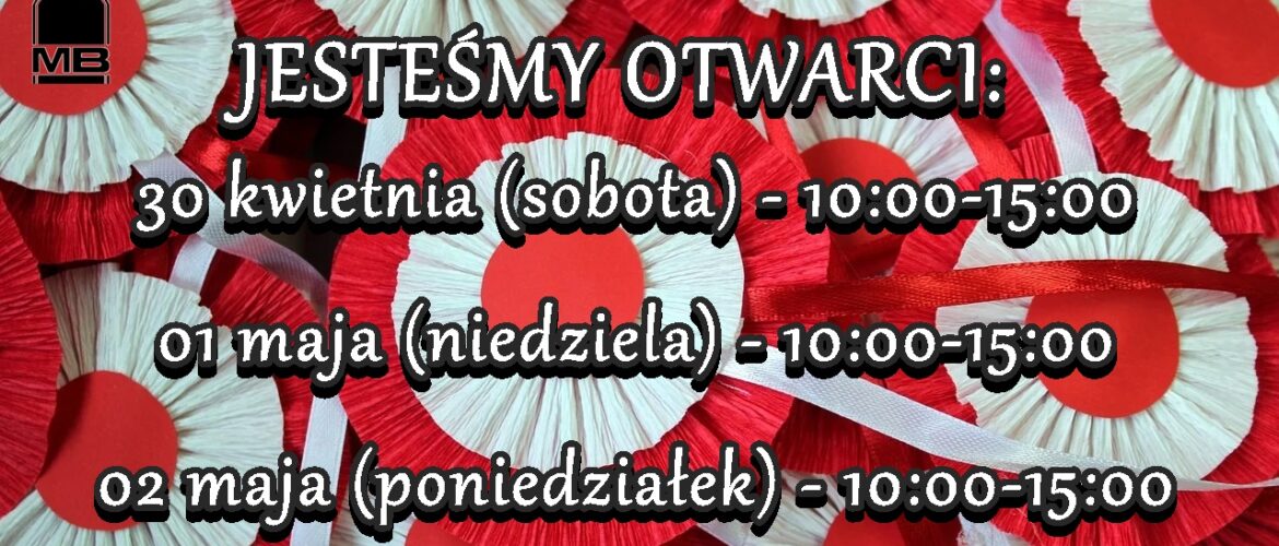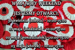 WEEKEND MAJOWY W MUZEUM Muzeum w Brodnicy będzie czynne przez cały długi weekend majowy, w godzinach: 30 kwietnia (sobota) – 10:00-15:00 01 maja (niedziela) – 10:00-15:00 02 maja (poniedziałek) – 10:00-15:00 03 maja (wtorek) – 10:00-15:00 ZAPRASZAMY!