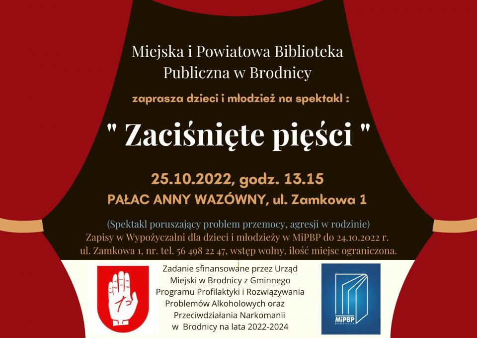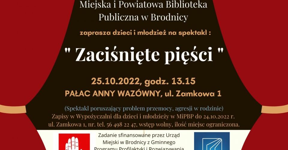 Miejska i Powiatowa Biblioteka Publiczna w Brodnicy zaprasza dzieci i młodzież 25.10.2022 r. o godz. 13:15 do Pałacu Anny Wazówny na spektakl profilaktyczny pt.: ”Zaciśnięte pięści” prezentowany przez Teatr Edukacji i Profilaktyki “MASKA” z Krakowa.