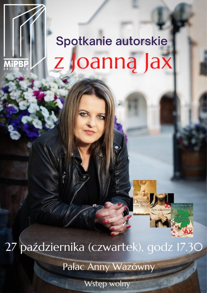 Miejska i Powiatowa Biblioteka Publiczna w Brodnicy zaprasza na spotkanie autorskie z Joanna Jax. Pisarka urodziła się i mieszka w Olsztynie. Zadebiutowała w 2014 roku „Dziedzictwem von Becków”. Kolejne powieści to m.in.: „Długa droga do domu”, „Piętno von Becków”, „Syn zakonnicy”, „W pogoni za nazistą”. Oprócz pisania powieści autorka maluje na szkle unikatową techniką warstwową, pasjonuje się literaturą biograficzną i grafiką. Zajmuje się również copywritingiem, pisze felietony i jest wolontariuszką w Fundacji dla Rodaka.