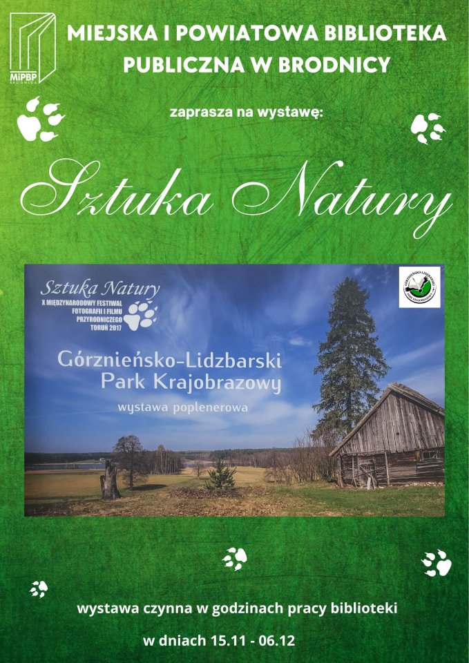 Od 15 listopada zapraszamy do Miejskiej i Powiatowej Biblioteki Publicznej w Brodnicy na wystawę pt. Sztuka natury. Ekspozycja jest plonem pleneru fotograficznego z 2017 r. zorganizowanym na terenie Górznieńsko – Lidzbarskiego Parku Krajobrazowego. Autorzy prac to: Marek Trzeciak, Jarosław Jeleński, Edyta Adamska, Anna Zwolińska, Piotr Olkiewicz, Adam Adamski.